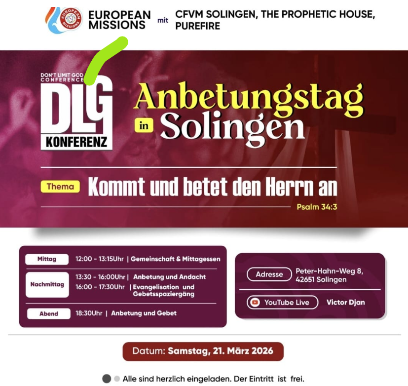 Home Events Anbetungstag in Solingen Anbetungstag in Solingen Alle sind herzlich eingeladen. Der Eintritt ist frei. + iCal / Outlook export Datum 21 März 2026 Lokale Zeit Zeitzone: America/New_York Datum: 21 März 2026 Ort EFG, Peter-Hahn-Weg 8 EFG, Peter-Hahn-Weg 8 Kategorie Anbetungstag